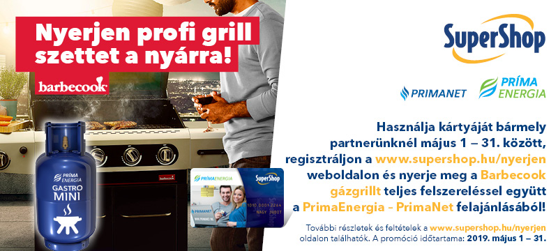 Használja SuperShop kártyáját bármely partnerünknél május 1 — 31. között, regisztráljon a www.supershop.hu/nyerjen weboldalon és nyerje meg a Barbecook gázgrillt teljes felszereléssel együtt a PrimaEnergia – PrimaNet felajánlásából!