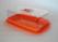A narancs színű, műanyag sütisdoboz, átlátszó tetővel készült. Hossza 365 mm, szélessége 210 mm, magassága 115 mm. A praktikus fedélen található süllyesztett fogantyú biztosítja a kényelmes használatot. A tálca a magasított peremrésszel 40 mm magas. A többfunkciós műanyag sütisdoboz kiválóan használható pl.: tárolásra, a hűtőben lefedve tarthatjuk a maradék sütiket, védi a megszikkadástól a szendvicseket és a csemege termékeket valamint tálalásra, a dekoratív tálcán a kész piskóta kihűthető, feldíszíthető, tálalható. A piros színű, műanyag sütisdoboz egyszerűen és könnyen tisztítható, mosogatógépben is mosható. Élénk, friss színe vidámmá varázsolhatja a konyhánkat.