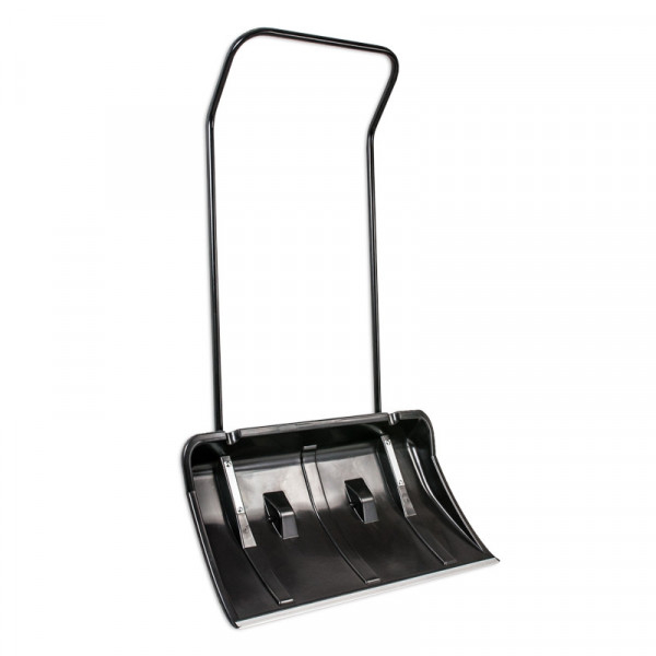 A műanyag, kerekes hótoló, hólapát stabil fém tolófogantyúval, két kerékkel és szegecselt fém élvédővel készült.