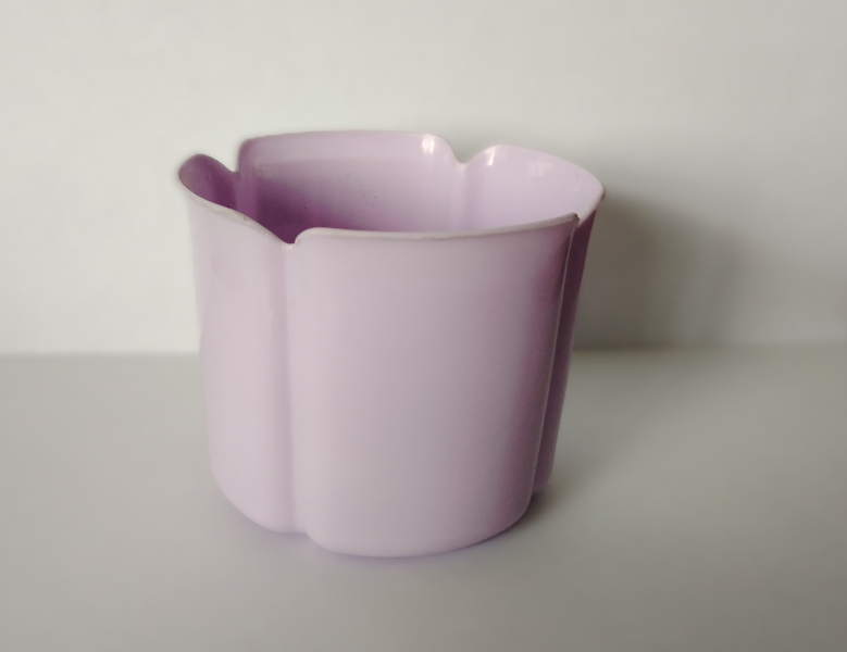 Átlátszó lila színű, műanyag, szirom formájú virágtartó kaspó . Az átmérője 80 mm.