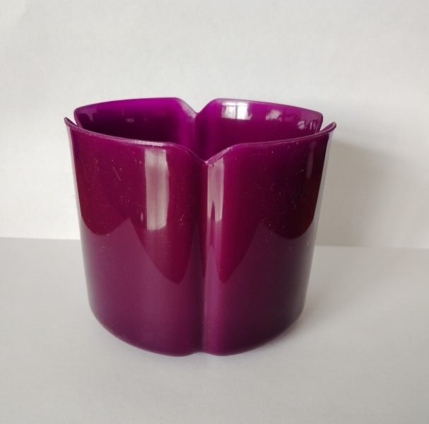 Halványlila sz ínű, műanyag, szirom formájú virágtartó kaspó . Az átmérője 110 mm.