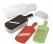 A Kyocera kerámia szeletelő szett tartalmaz 1 darab állítható szeletelőt, 1 darab "Julienne" szeletelőt, 1 darab műanyag reszelőt és 1 darab kézvédőt, mindez egy formatervezett dobozban tárolható, ami szeleteléskor gyűjtő dobozként is használható, így a szeletelt zöldség, gyümölcs, sajt nem szóródik szét.
