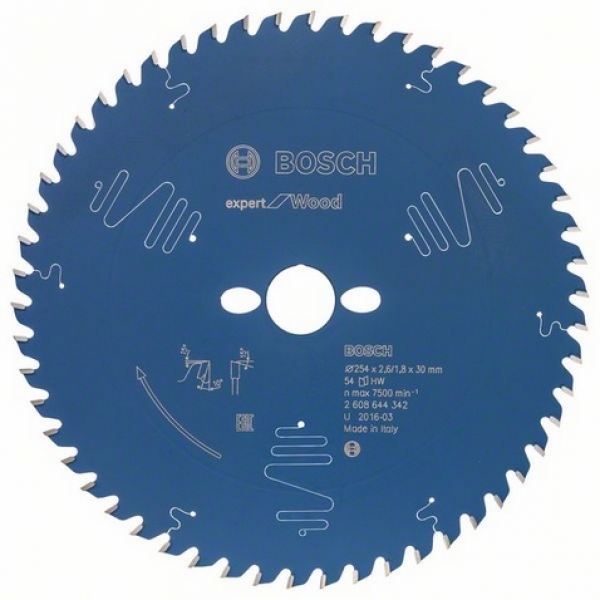 Bosch körfűrészlap EX WO T 254x30-54 (2 608 644 342). Külső átmérője 254.0 mm, furat átmérője 30 mm. Vágásszélesség (b1) 2,6 mm, törzslap-vastagság (b2) 1,8 mm. A körfűrészlap fogak száma 54, fogforma ATB.