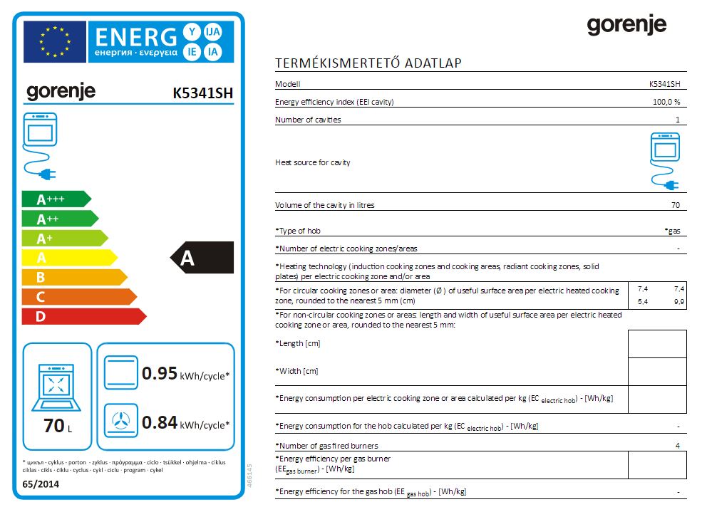 A Gorenje kombinált tűzhely K5341SH az A energiaosztályba tartozik és négy gázégővel ellátott. Szélessége 50 cm, magassága 85 cm, hosszúsága 59,4 cm.
