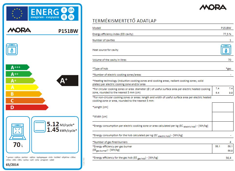 A Mora gáztűzhely P151BW készülék 1 kicsi, 1 nagy és 2 normál gázégővel rendelkezik. A bal első kis gázégő 5,4 cm átmérőjű és 1 kW-os, a jobb első nagy gázégő 9,9 cm átmérőjű és 3 kW-os, a jobb és bal hátsó normál gázégő 7,4 cm átmérőjű és 1,9 kW-os.