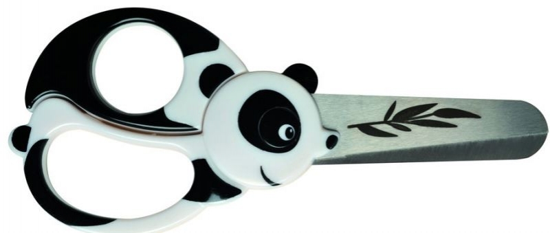 Fiskars panda formájú gyermekolló (1382). A kerekített élvég segít elkerülni a sérüléseket. Az olló hossza 13 cm, a penge hossza 6 cm.