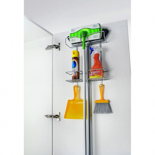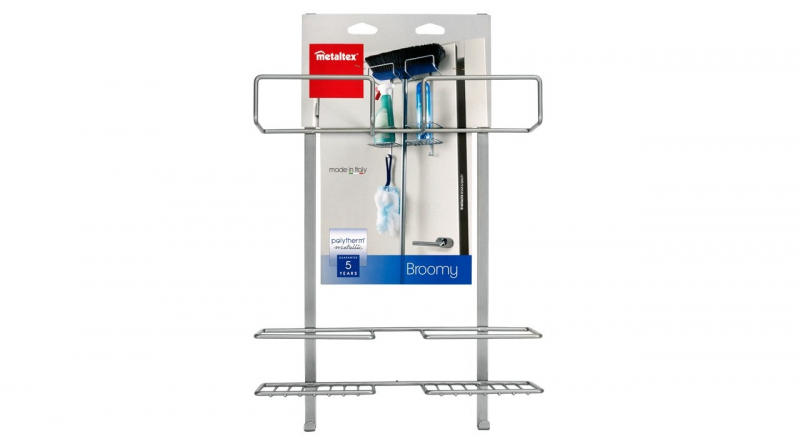 A Metaltex Broomy takarítóeszköz tároló (350902), kitűnő minőségű, olasz gyártmány. Segítségével könnyen és praktikusan tárolhatja takarítóeszközeit. Szélessége 30 cm, magassága 46 cm, hosszúsága pedig 12 cm. Az ajtóra akasztható takarítóeszköz tároló dupla hőkezelést kapott , rozsdaálló és portaszító.