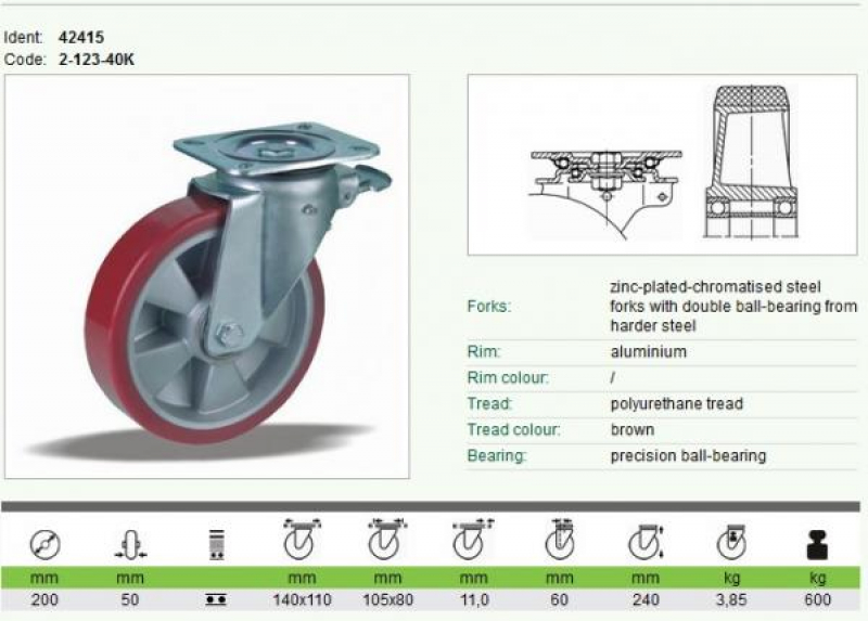 Kerék nagy teherbírású önbeálló alumínium PU 800 kg fékezhető 200 42415