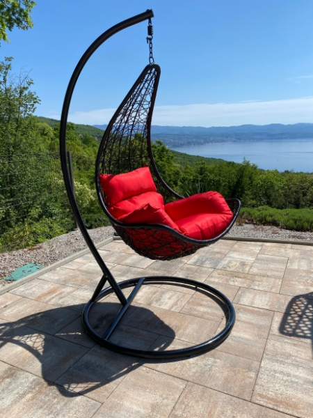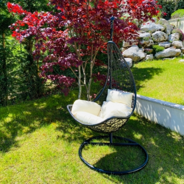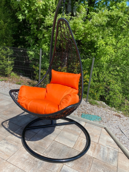 Ez a kényelmes függőfotel műrattan kosárral, több színű párnával, porszórt fém váz szerkezettel kapható.