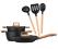 • három konyhai eszközből álló készlet (kanál, spatula és merőkanál) kiváló minőségű bükkfából és termoplasztikus műanyagból, amelyek 210°C-ig ellenállnak a magas hőmérsékletnek