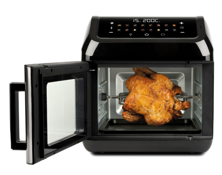 Az átlátható, belső világítással ellátott 13 literes sütőtér, valamint a soft-touch vezérlők lehetővé teszik, hogy bármikor ellenőrizhesd az ételek állapotát. A rozsdamentes acélból készült forgó kosár, nyársak és grillrácsok pedig a tartósságot és a könnyű tisztítást biztosítják. A készülék elegáns megjelenése bármelyik konyhában stílusos kiegészítővé válik.