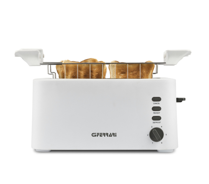 Az olasz G3Ferrari Essential Toast egy klasszikus, kifinomult kialakítású kenyérpirító, amellyel egyszerre 4 töltött pirítóst vagy 2 nagy szelet házi kenyeret süthetünk. Használata praktikus, a sütési idő programozása mellett kiolvasztani, melegíteni és melegen tartani is tudja az ételeket. 1500 W teljesítménnyel nagyon rövid idő alatt egyenletesen megpirít akár vastag kenyérszeleteket is. A rozsdamentes acél fogók maximális biztonságot nyújtanak, hogy ne égesse meg a kezét. A kivehető morzsatálca pedig megkönnyíti a tisztítást.