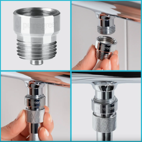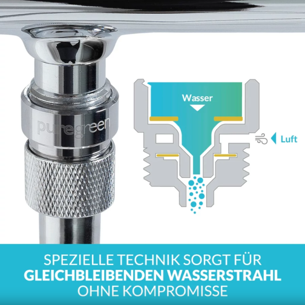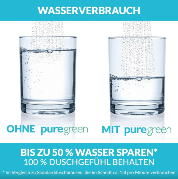 • A puregreen zuhanyvíz-megtakarítóval egyszerűen és egyszerűen takaríthat meg vizet. Egyszerűen csavarja fel kézzel szorosan a zuhanyszerelvényre vagy a fejzuhanyra, és kész. A speciális technológiának köszönhetően az átfolyó vizet levegővel örvénylik és ismét felgyorsítják. Ez akár 50%-os* vízmegtakarítást is biztosít – 100%-os egyenletes zuhanyélmény mellett. Ez értékes erőforrásokat takarít meg, és kíméli a pénztárcáját.