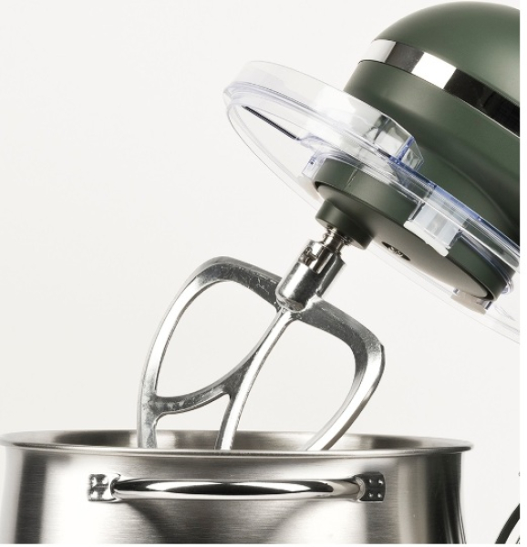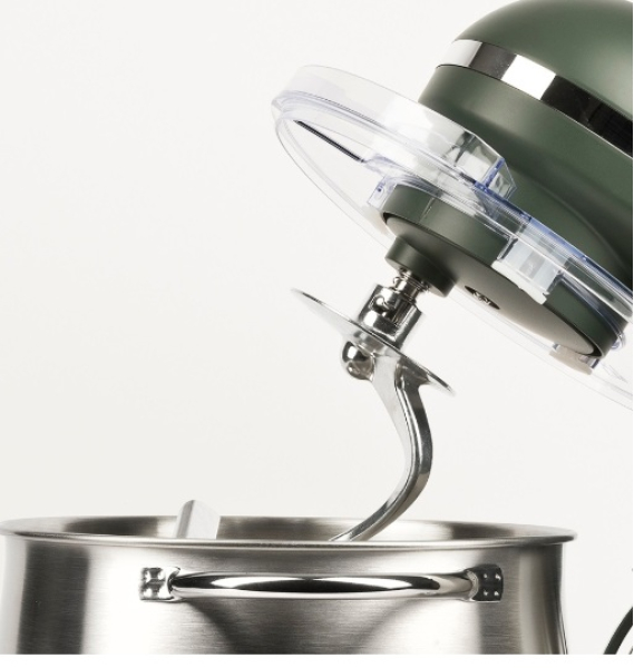 A rozsdamentes acélból készült 8 literes tartály, a dagasztóhorog és keverőalumínium tartozékok, valamint a habverő tökéletes partnerei a konyhai kalandoknak.Az átlátszó műanyag fedél pedig megakadályozza a fröccsenést.