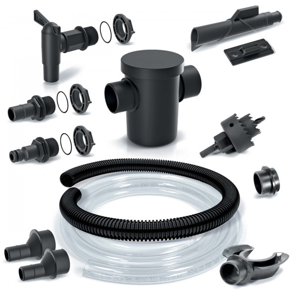 • Esővízgyűjtő tartály ereszcsatornába való bekötéséhez szükséges komplett szett, lyukfúróval és külső szűrővel.