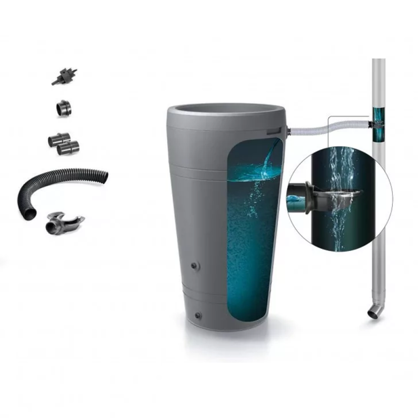 • Esővízgyűjtő tartály ereszcsatornába való bekötéséhez szükséges komplett szett, lyukfúróval és külső szűrővel.
