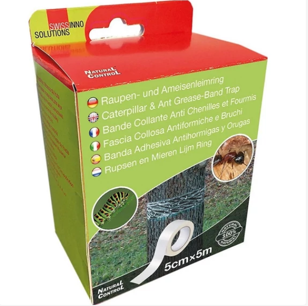 A Swissino ragasztószalag csapda a szárny nélküli kártevőket ragadja meg erős ragasztóbevonatán és így akadályozza meg, hogy felkapaszkodjanak a fákra.