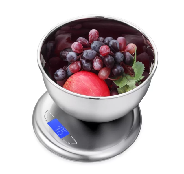 A mérleghez tartozik egy 1,5 literes rozsdamentes acél tál, amely praktikus és esztétikus.