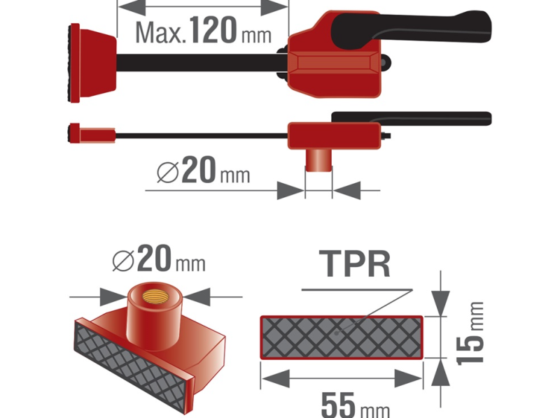 O 20 mm rögzítőcsonk, 0 mm - 120 mm befogási tartomány, 55 mm × 15 mm csúszásgátló TPR borítású támasztó felület