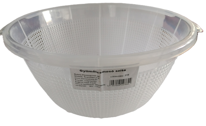 A gyümölcsmosó műanyag szita átmérője 270 mm, magassága 130 mm. Kiválóan használható a különböző ételféleségek, zöldségek és gyümölcsök előkészítésére valamint tálalására.