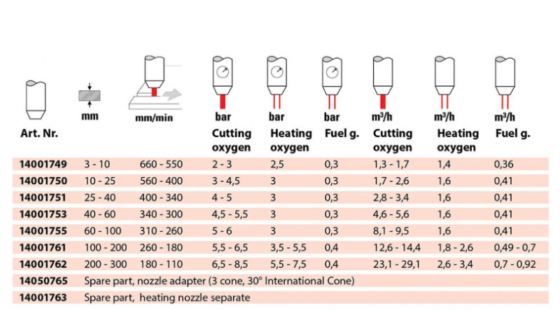 A fúvóka propánra és földgázra lett kialakítva. A vágó és a hevítő fúvókákat egyaránt egy termékként szerelve szállítjuk. A K50 100 mm-ig terjedő acéllemez vastagság vágására, a K70 100-300 mm-ig használható.