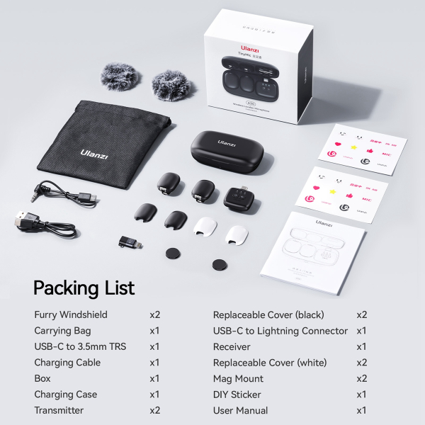 Az Ulanzi A30 vezeték nélküli mini lavalier mikrofon egy kompakt és professzionális hangrögzítési megoldás, amely tökéletes vloggerek, tartalomkészítők, interjúk és élő közvetítések számára. A csomagban két mikrofon és egy vevőegység található, így ideális két személy egyidejű rögzítésére. USB-C és Lightning kompatibilitásának köszönhetően széles körben használható okostelefonokkal és egyéb eszközökkel.