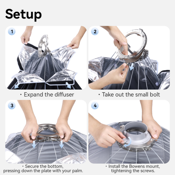 A softbox gyorsan nyitható és összecsukható mechanizmussal rendelkezik, amely lehetővé teszi az egyszerű és gyors felállítást. Különösen hasznos helyszíni fotózások és dinamikus stúdiómunkák során.