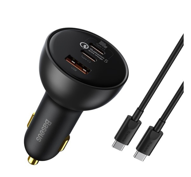 Baseus QUALCOMM autós töltő USB+2 Type-C aljzat (100W, PD gyorstöltő 5.0 + Type-C kábel) FEKETETZCCZ