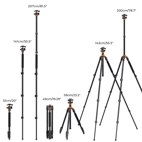 Az állvány 50 cm és 196 cm között állítható. A levehető középoszlop és láb külön monopodként is használható, amely akár 215 cm-ig is kihúzható, így rugalmas megoldást nyújt különböző helyzetekhez.