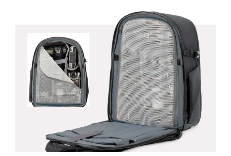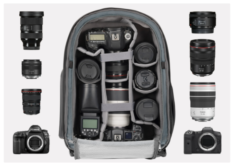 • Akkumulátor és aprócikk zseb: Az elülső akkumulátorzseb négy akkumulátor számára kínál külön tárolóhelyet, továbbá alkalmas kisebb kiegészítők, például kábelek és szűrők elhelyezésére is.