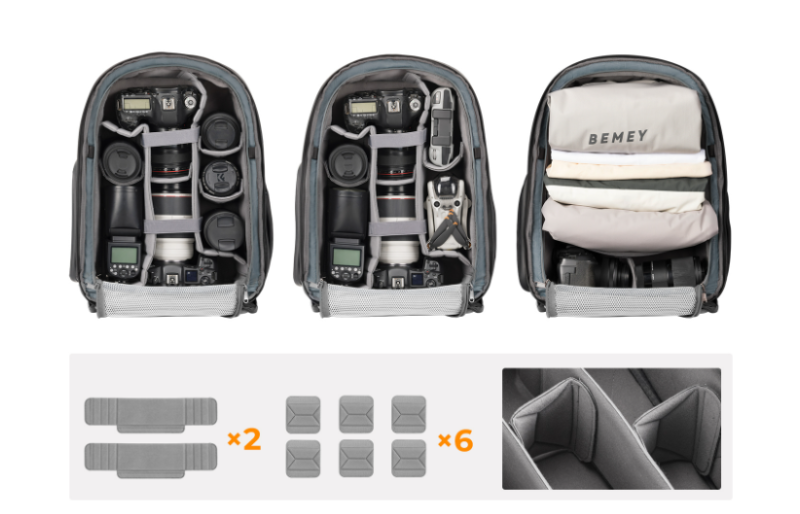 • Elülső nyitás, lopásvédelemmel: 180°-os teljes nyitású elülső cipzáras rekesz, amely gyors és átlátható hozzáférést biztosít. A belső elrendezés szabadon variálható, így akár 2 fényképezőgép váz és több objektív is rendszerezhető benne.