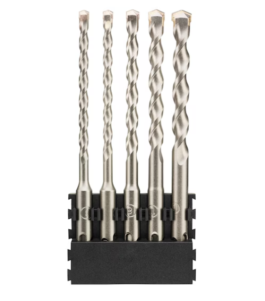 5 db hegytartó + SDS Plus fúrók 6 × 160 mm (×2), 8 × 160 mm (×1), 10 × 160 mm (×1), 12 × 160 mm (×1)