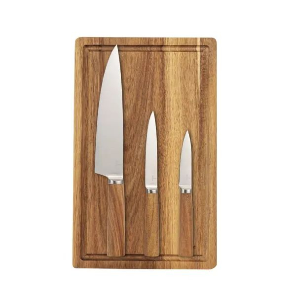 A vágódeszka kontúrozott csatornákkal rendelkezik, amelyek hatékonyan megtartják a felaprított ételek leveit.
