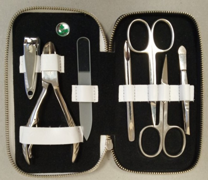 Tartalma: solingeni hajlított körömvágóolló, solingeni hajlított bőrvágóolló, Dup körömvágó fogó (10,5 cm), ferde szemöldökcsipesz, kicsi körömcsipesz (5,5 cm), bőrfeltolólapát kaparóval, üveg körömreszelő (9 cm).