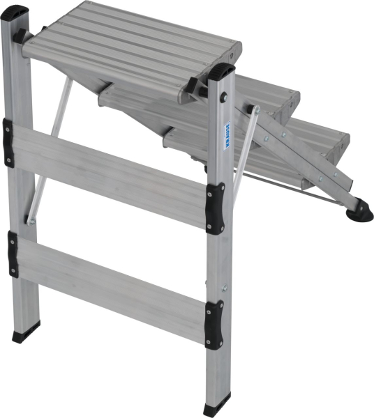• A robusztus, összecsukható alumínium lépcső bordázott fokokkal a legkülönfélébb feladatokhoz biztosít biztonságos fel- és lelépést, valamint kényelmes, laza tartásban történő munkavégzést.
