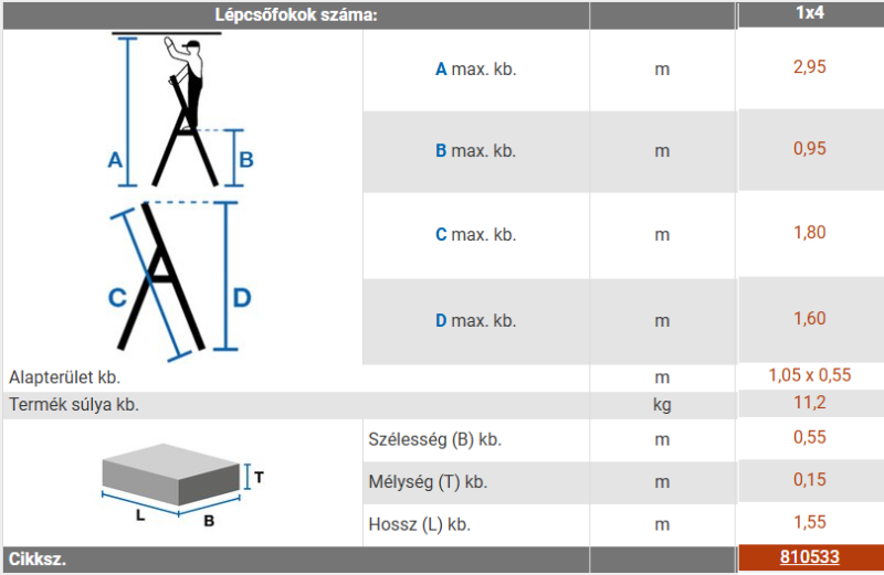 A létra/állvány pontos méretei a mellékelt képen!