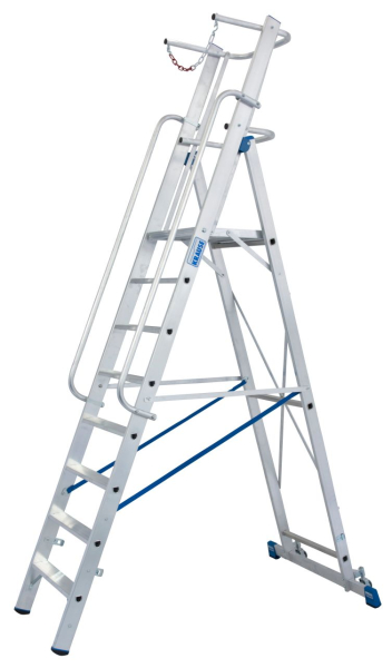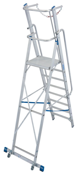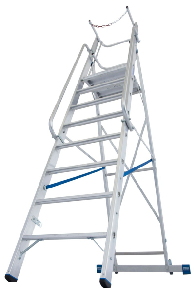 • A gurítható lépcsőfokos alumínium állólétra nagyobb és kényelmesebb állófelülettel és körbefutó zuhanásvédelemmel.