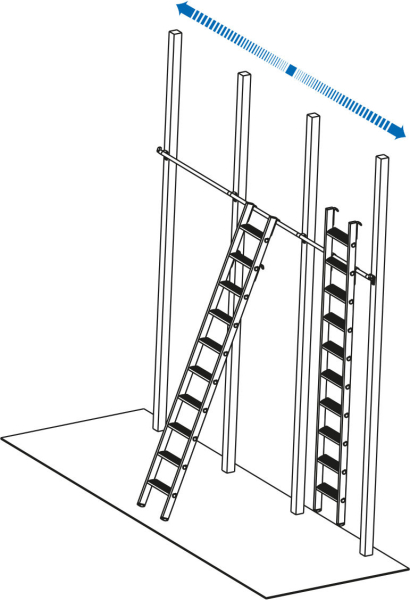 Használatkor a szárak felső végén található 2 kampóval akasztható a csősínre a létra. A lejjebb található 2 kampó a használaton kívüli helytakarékos tárolást segíti
