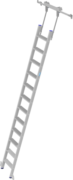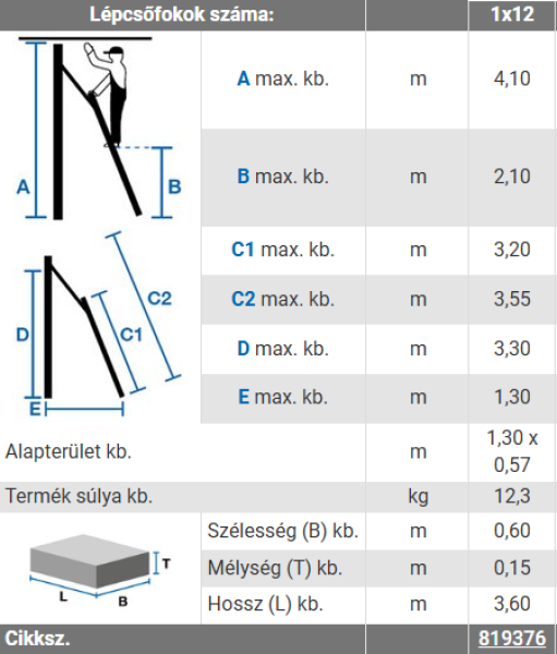 A létra dőlésszöge 21°, így tárolási helyzetben helytakarékosan helyezkedik el függőlegesen a polc mellett