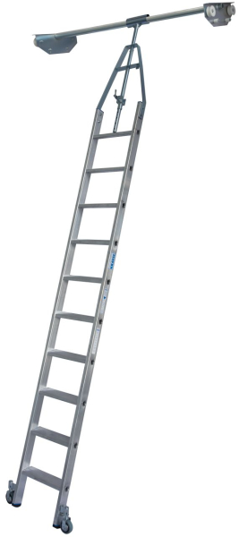 Lépcsőfokos alumínium polclétra az átfordítható sínrendszerhez használható integrált futószerkezettel.