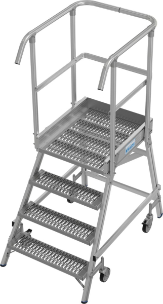 Két oldalon járható gurítható alumínium dobogó 180 mm mély lépcsőfokokkal és nagy állófelülettel R13 csúszásmentes profilrácsból, amely körbefutó dobogókorláttal van felszerelve a biztonságos és kényelmes munkavégzés érdekében