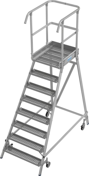 Két oldalon járható gurítható alumínium dobogó 180 mm mély lépcsőfokokkal és nagy állófelülettel R13 csúszásmentes profilrácsból, amely körbefutó dobogókorláttal van felszerelve a biztonságos és kényelmes munkavégzés érdekében