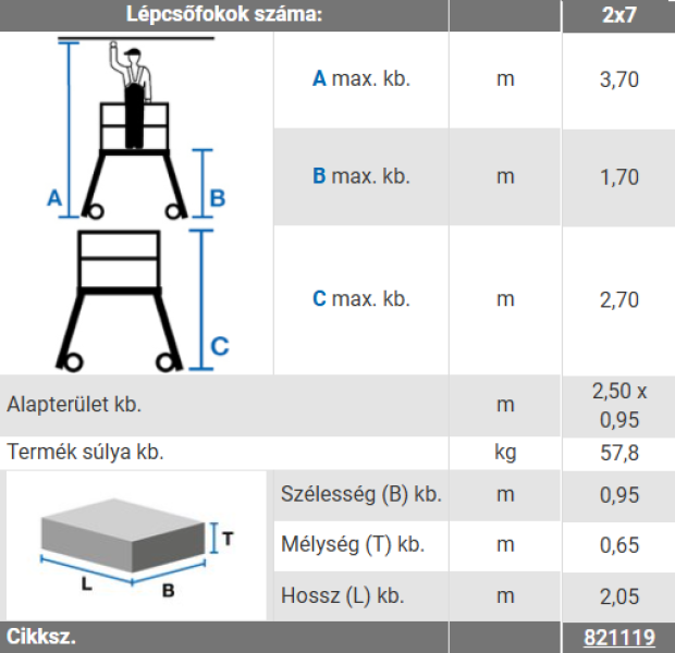 Egy oldalon járható gurítható alumínium dobogó 175 mm mély, csúszásmentes lépcsőfokokkal és nagy állófelülettel, amely körbefutó korláttal van felszerelve a biztonságos és kényelmes munkavégzés érdekében