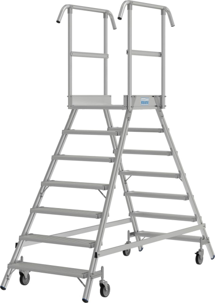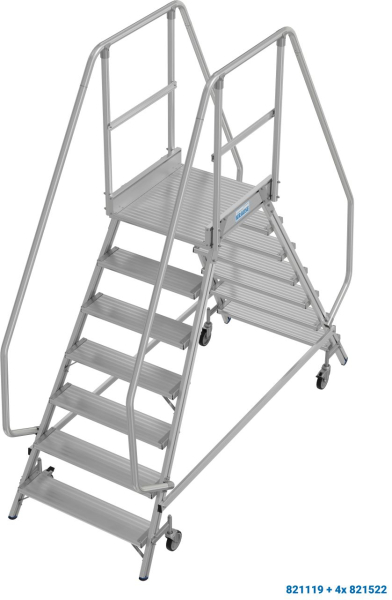 Két oldalon járható gurítható alumínium dobogó mély lépcsőfokokkal és nagy állófelülettel a biztonságos és kényelmes munkavégzés érdekében.
