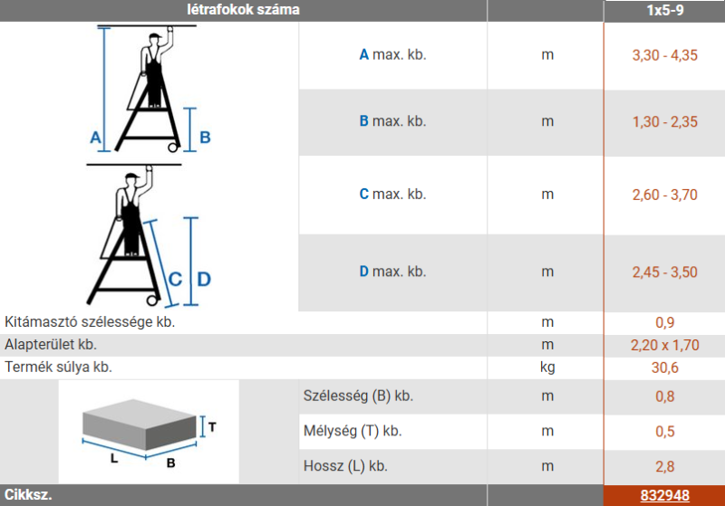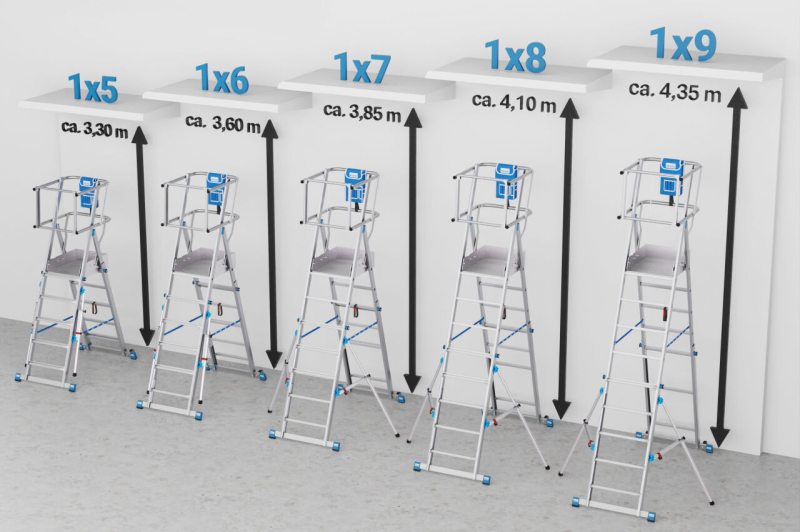 2,80 m - 3,30 m munkamagasság érhető el az 1x3 - 1x5 lépcsőfokos változattal és 3,30 m - 4,35 m munkamagasság az 1x5 - 1x9 lépcsőfokos változattal