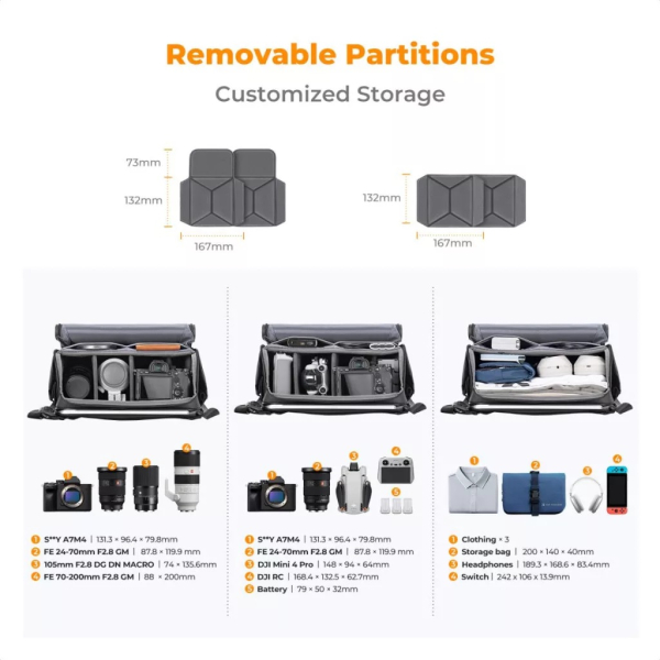 • A táska tökéletesen alkalmas a legfontosabb fotós eszközök, például a fényképezőgép, objektívek és kiegészítők tárolására, így ideális a városi és szabadtéri fotózásokhoz is.
