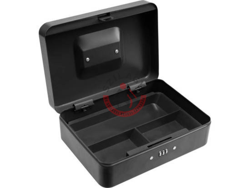 • Hordozható pénzkazetta 250mm x 180mm x 90mm méretű, 0,7 mm vastag acéllemezből, feketére festve.