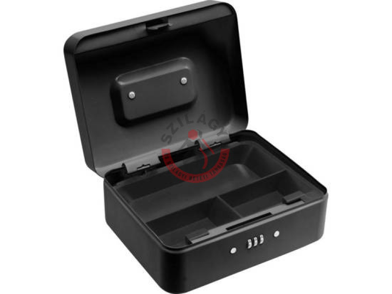 • Hordozható pénzkazetta 200mm x 160mm x 90mm méretű. 0,7 mm vastag acéllemezből, feketére festve.