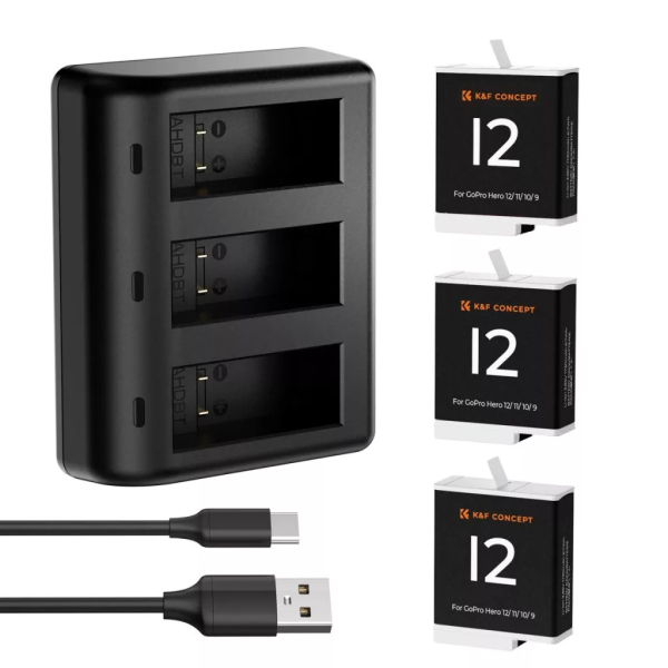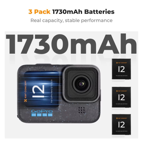 • A K&F Concept HERO 12 akkumulátorcsomag egy megbízható és nagy kapacitású energiaforrás, amely kifejezetten a GoPro HERO 12, HERO 11, HERO 10 és HERO 9 Black kamerákhoz lett tervezve.