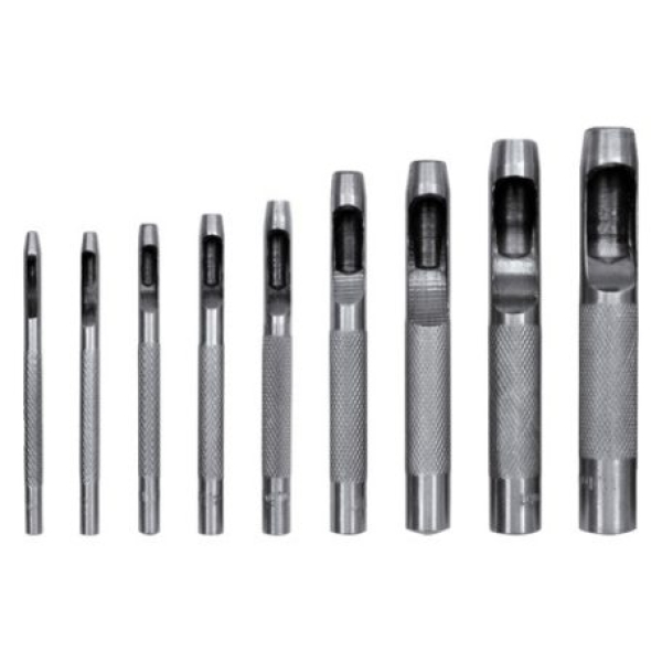 Bőrlyukasztó keményített szénacélból, polírozva. Furatokkal vannak ellátva, amelyek eltávolítják a vágott anyagot.
